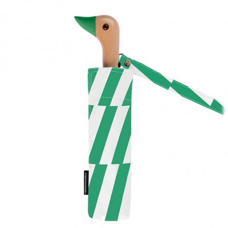 Des motifs sympas en vert imprimé sur une toile Blanche solide et recyclée. Le manche est en bois massif et représente une tête de canard très fun ou se trouve le petit bouton pour l’ouverture automatique. Enfin la structure est en acier et aluminium très résistant pour les forts coups de vent.
