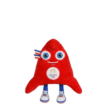 Une mascotte rouge qui représente un Phryge. La peluche de Jeux Olympiques de Paris 2024 est disponible en plusieurs tailles
